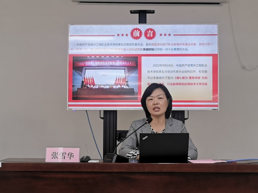 张雪华从大会召开的背景、意义、深入领会大会的主题、学校五年来取得的重要成就、过去五年的宝贵经验、创建全国有特色、行业能领军的应用技术大学的重要意义、今后五年学校工作的指导思想、今后五年学校工作的发展目标、今后五年学校工作的重点任务部署、学校党风廉政建设取得的新进展和今后五年的工作任务等方面为大家作了全面系统的讲解。在场全体师生加深了对学校第五次党代会精神理解,增强了高质量做好学院各项工作的信心。