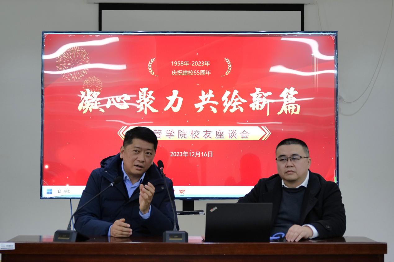 凝心聚力共奋进,同心逐梦谱新篇。重拾旧忆,再续情长。值此65周年校庆之际,学院顺利举行校友代表座谈会。学院党总支书记徐标、副书记华亚、辅导员、校友代表、在校生代表齐聚一堂,共叙往昔师生情谊,共话未来发展篇章。徐标代表学院向来自各行业的校友代表表示热烈欢迎,并对校友关心和支持学校、学院建设发展致以诚挚感谢。随后,他向校友们介绍学院近年来取得的突出成绩及发展规划。他强调,学院在教学科研、人才培养等方面取得的成绩离不开各位校友的大力支持。座谈会上,校友们回忆曾经在校求学的难忘经历,表达对学院多年培养的感激之情,大家畅所欲言、各抒己见,纷纷为母院发展献计献策。在和学弟学妹交流环节,现场气氛活跃,多名在校同学围绕专业前景、毕业去向、职业规划等方面问题踊跃提问,校友代表根据提问予以耐心解答。