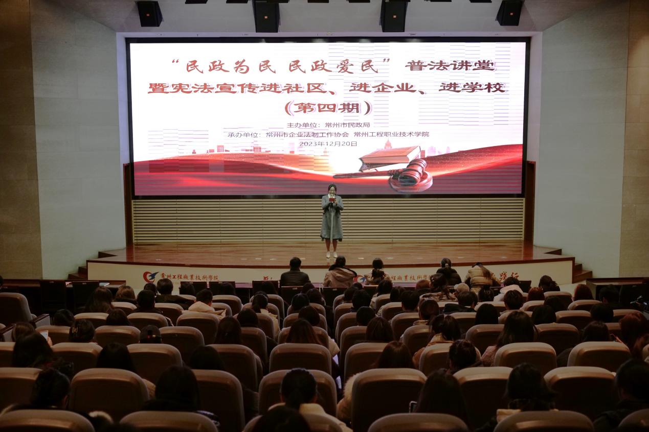 为积极响应常州市第六个“宪法宣传周”暨第八个“法治宣传月”活动,12月20日,由常州市民政局主办,常州市企业法制工作协会和我校联合承办的“民政为民、民政爱民”普法讲堂暨宪法宣传进社区、进企业、进学校(第四期)活动在图书馆一楼报告厅举行,我校师生代表共400余人参加活动。
