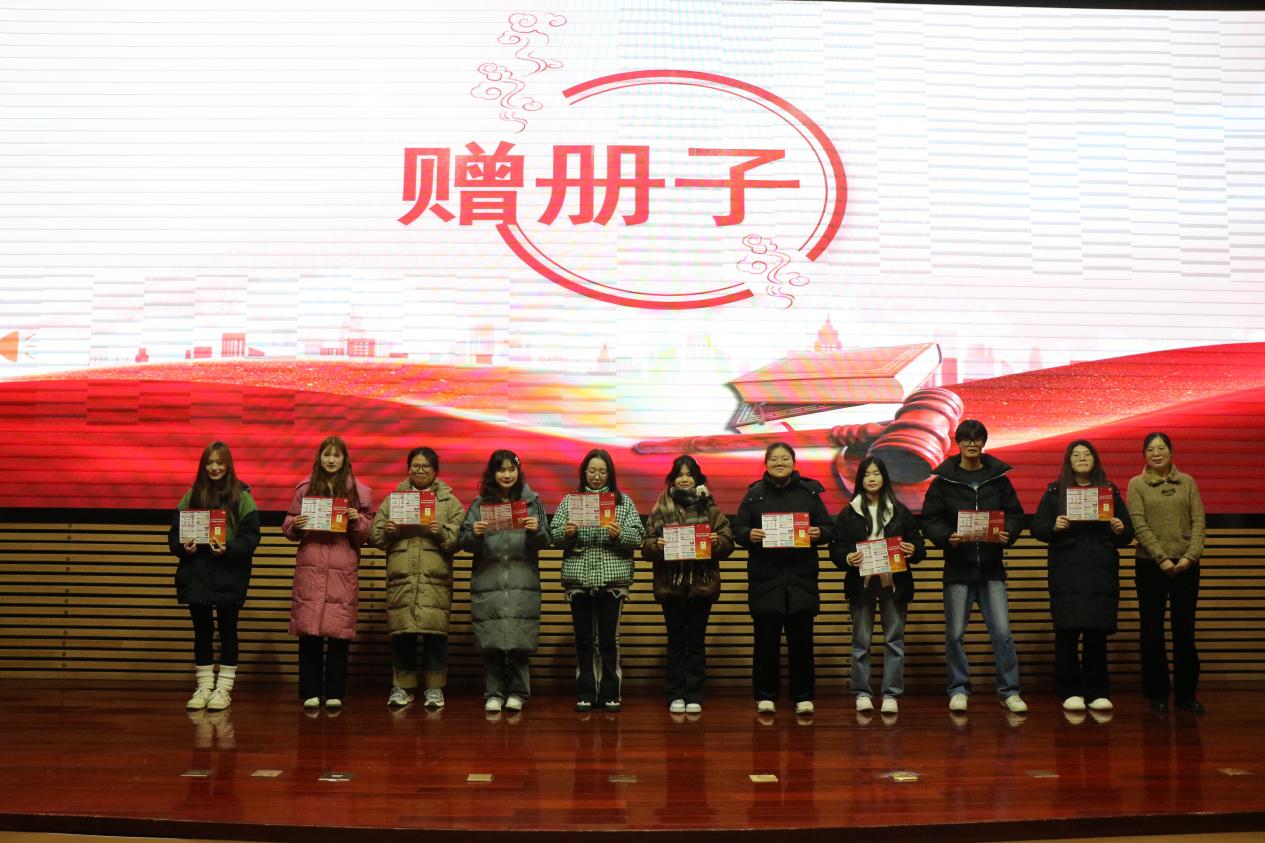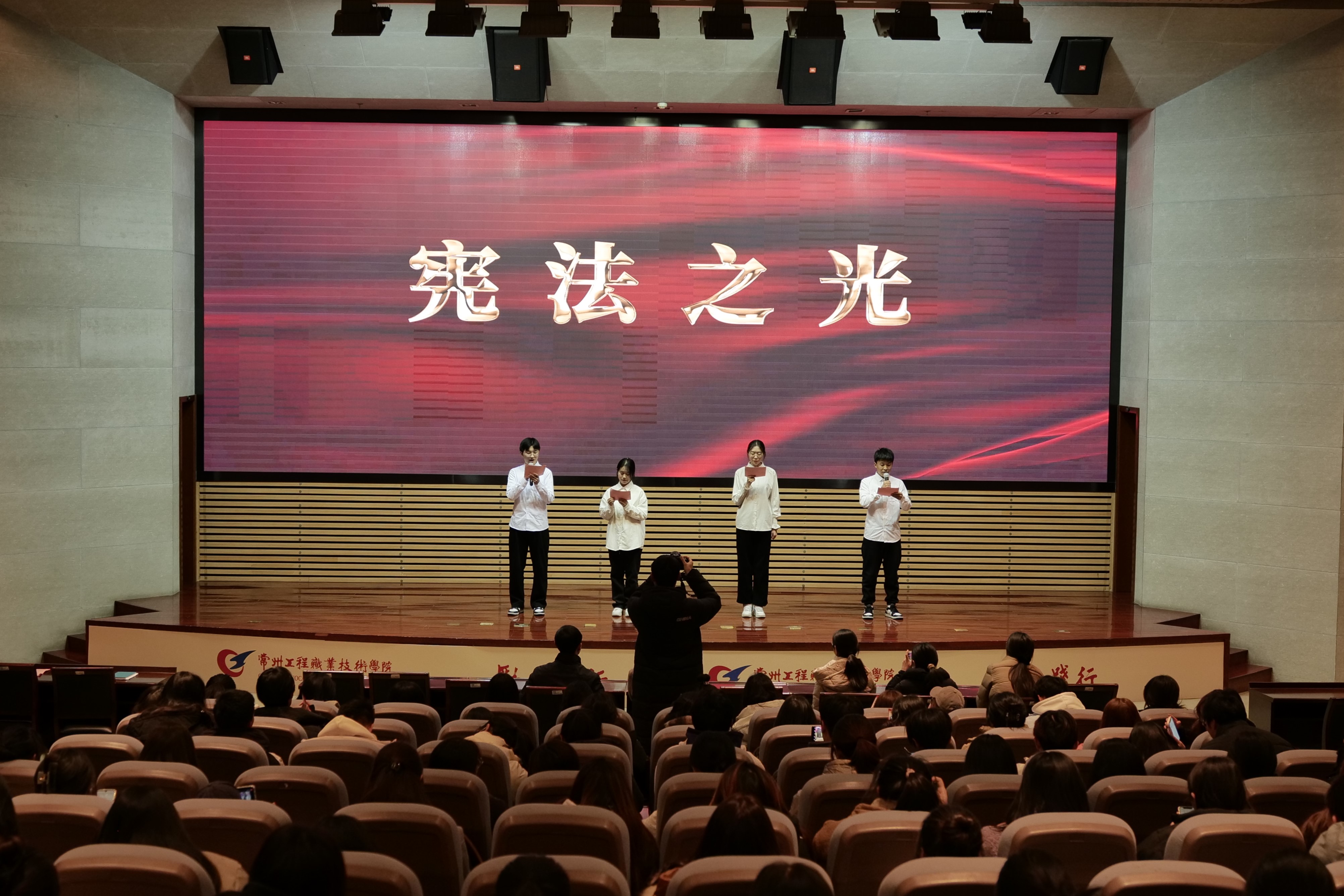 一首明快悠扬的《公民道德歌》拉开了普法讲堂的序幕。在“悟思想”环节,在场师生再次学习习近平总书记提出的推进全面依法治国“十一个坚持”的要求;在“讲故事”环节,大家观看了常州市民政局制作的防诈骗动画视频,进一步提高防范电信网络诈骗的意识;在“学法律”环节,通过知识竞答的形式一起学习法律知识,现场气氛热烈,大家踊跃参与;在“赠册子”环节,我校教师代表向学生赠送普法宣传册;在“诵经典”环节,学生代表一起诵读中华传统文化经典《管子·明法解》中关于法治的论述;在“颂宪法”环节,学生代表深情朗诵了《宪法之光》,宣传宪法、歌颂宪法,推动宪法精神在高校落地生根。