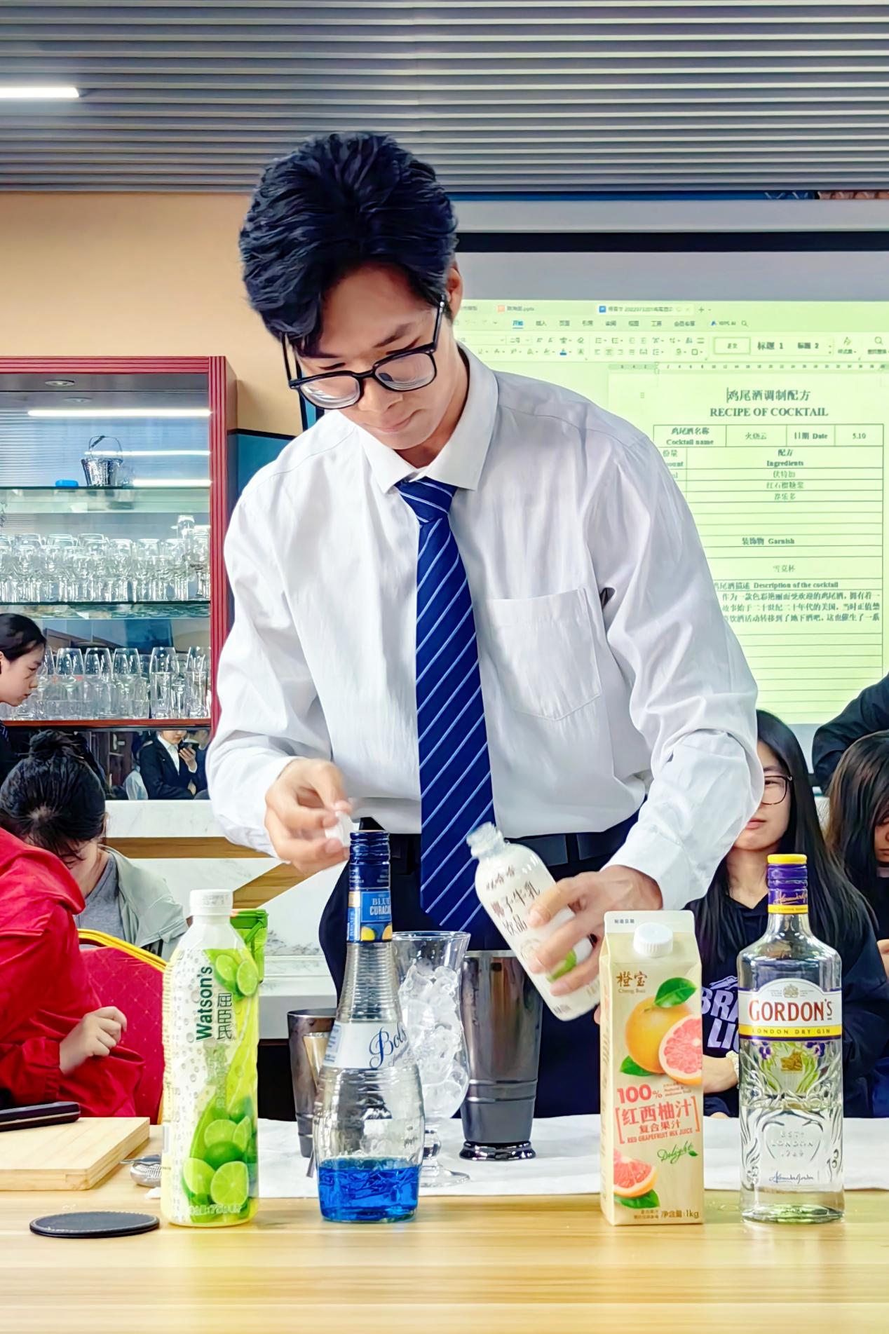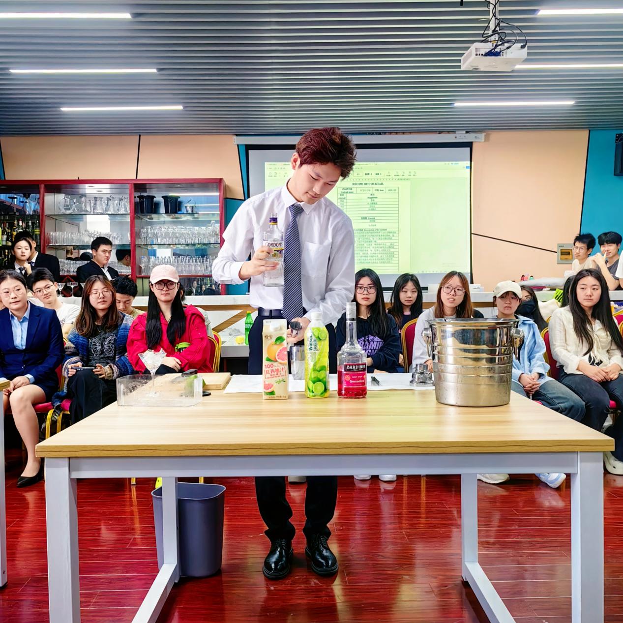 为深入学习贯彻党的二十大精神,充分发挥技能竞赛引领教育教学改革、展示教学成果和提升教育质量的重要作用,提升酒店管理与数字化运营专业学生酒水服务技能,形成比学习、比技能的良好氛围,达到“以赛促学,以赛促教,以赛促改”的目的,经管学院于5月10日在合一楼505实训室成功举办2024年校级酒水服务技能竞赛。经管学院副院长、酒店管理与数字化运营教研室主任罗元,酒管教研室全体教师以及2022级酒店管理与数字化运营专业学生共计90余人参加了竞赛活动。
