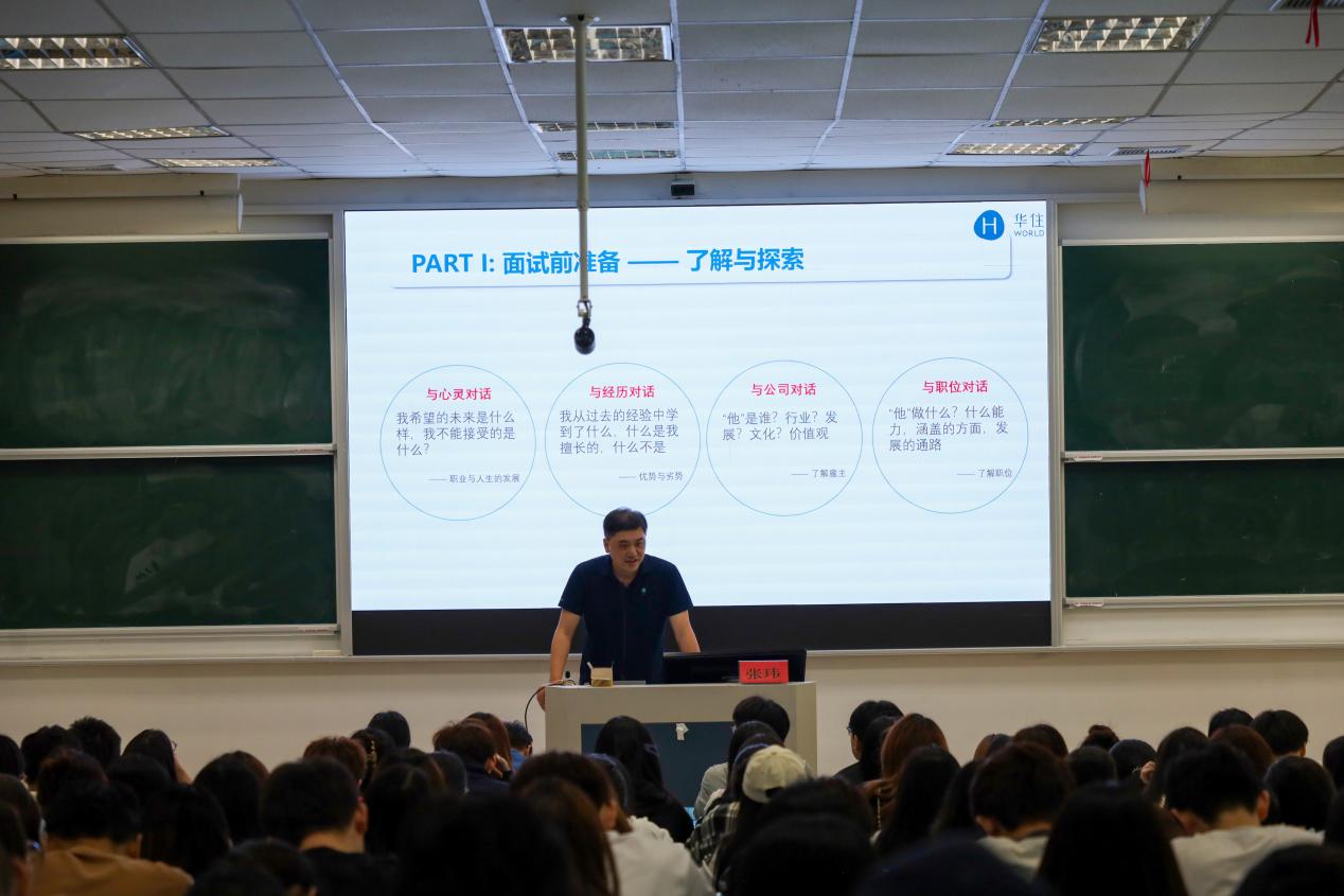 会议伊始,华亚介绍了与会人员及召开本次大会的目的和意义。华住集团校企合作负责人、高级经理张玮为同学们作专题报告。张玮经理紧紧围绕“认清就业形势、明确就业目标、善用求职技巧”等方面展开讲解,引导同学们合理审视就业环境,淬炼就业意志,及时掌握就创业政策,充分认识到提升核心就业竞争力及理论结合实践的重要性。