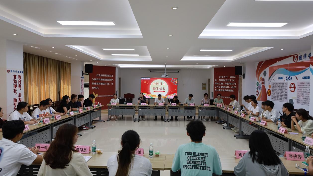 中秋月语,师生情长。 近日,中秋师生座谈会在温馨的氛围中举行。学院党总支书记徐标、学院关工委常务副主任李洪涛、全体辅导员以及假期留校的20余名新生代表齐聚一堂,共叙师生情,共话新发展。座谈会由党总支副书记华亚主持。会前,老师们为参会学生分发月饼并送上节日祝福。徐标在致辞中向全体学生表达了亲切的问候和关心,分享了自己对于中秋佳节的理解和感悟,鼓励同学们珍惜时光,努力学习,并承诺学院将始终如一地关爱学生,及时解决实际问题,共同为学生成长成才、学院高质量发展助力。随后,李洪涛结合自己丰富的工作经验和专业知识,深入浅出地分析了当前的社会形势和发展机遇,激励同学们树立远大理想和目标,勇敢面对挑战,积极进取,不断提升自身核心竞争力。在交流互动环节,学生代表们踊跃发言,围绕学习和生活提出问题和困惑,老师们认真倾听并给予耐心细致的解答和指导。本次座谈会不仅加深了师生情谊,也为学生解决了切实疑难问题,增强了学院的凝聚力和向心力。