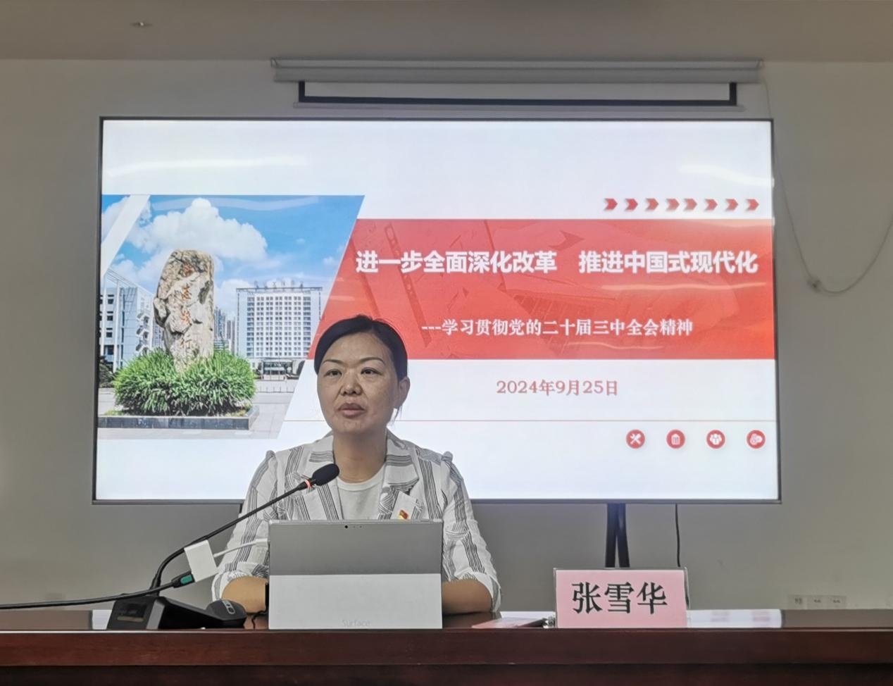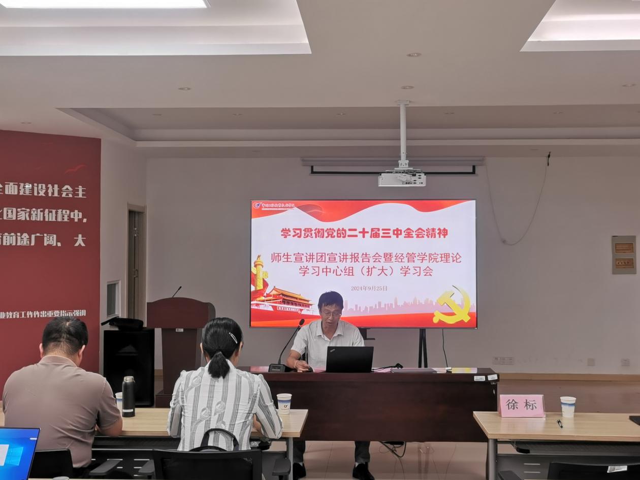 9月25日下午,经管学院举行学习贯彻党的二十届三中全会精神师生宣讲团宣讲报告会暨理论学习中心组(扩大)学习会,师生宣讲团成员、校党委委员、副校长张雪华作辅导报告。经管学院理论学习中心组成员、全体教职工、继续教育学院直属党支部全体党员参加了本次学习,报告会由党总支书记徐标主持。