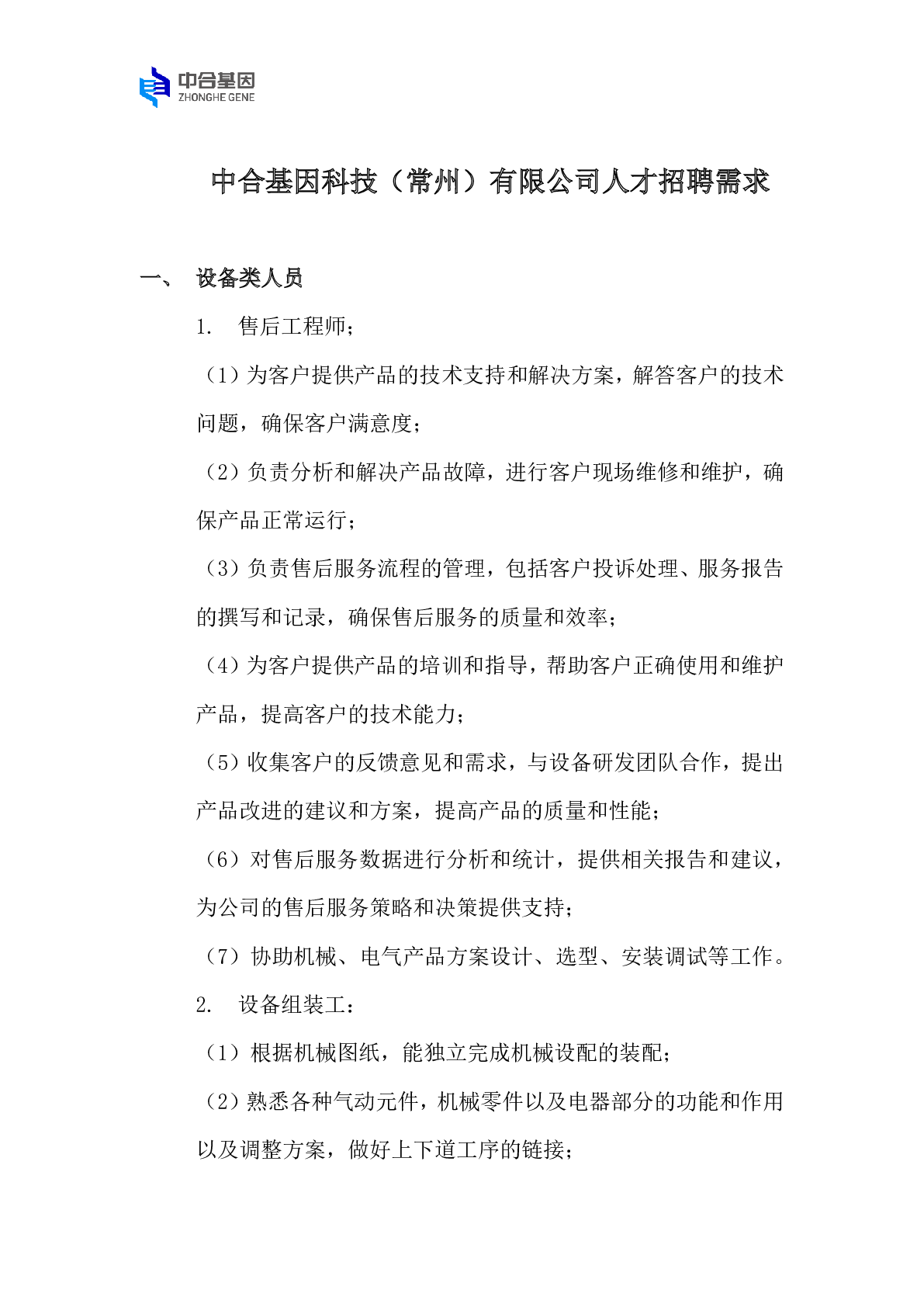 中合基因科技(常州)有限公司人才招聘需求