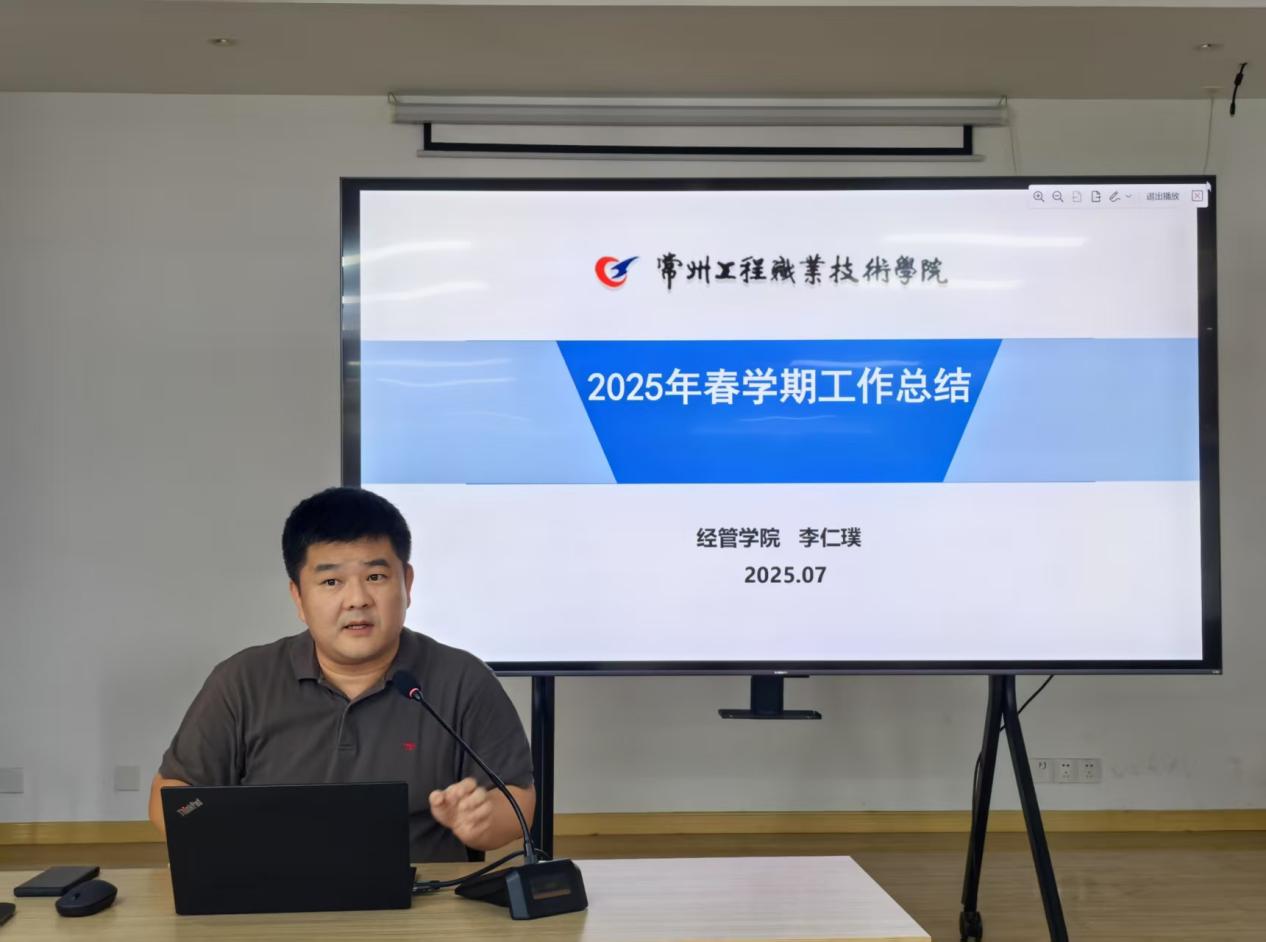 接着,经管学院院长李仁璞作本学期工作总结及暑假工作部署,首先他指出本学期学院专业建设工作成效显著,在教学能力大赛、技能大赛中屡获佳绩,实习就业数据居于全校第一方阵,专业国际化步伐显著加快。他客观分析当前工作存在的不足,指出数字化课程教学改革需要进一步深化,社会服务能力与师资国际化水平还有明显短板。明确下阶段重点工作包括打造高水平数字化教学资源、强化国际化师资与科研能力、加强社会培训团队建设、拓展社会培训项目等。