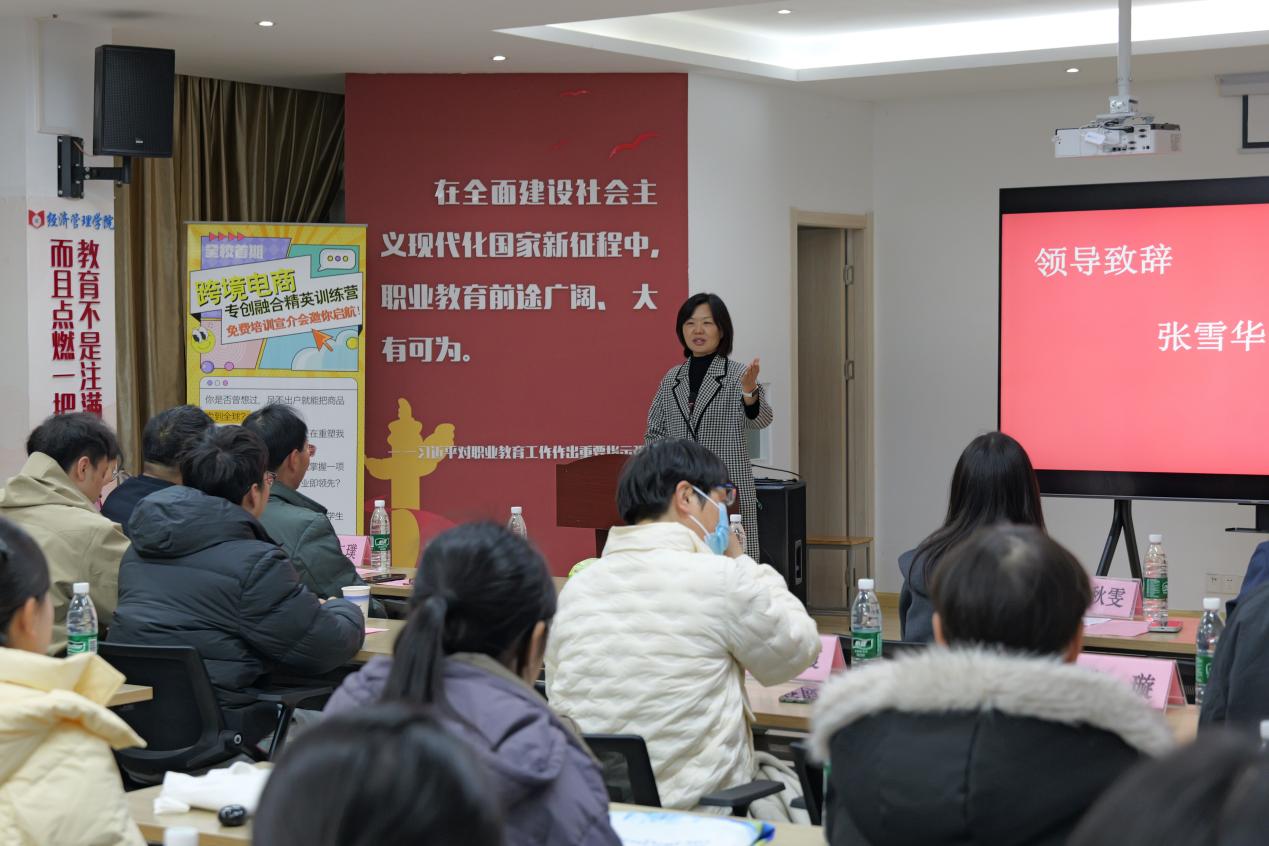 张雪华在致辞中强调了学校对跨境电商人才培养的高度重视。她指出,跨境电商作为外贸新业态,已成为经济增长的重要引擎,学校举办此次集训营,既是赋能学生高质量就业的务实举措,也是深化产教融合的生动实践。她希望学员们以空杯心态投入学习,在实战中锤炼技能,积累高端就业的 “硬核” 资本。