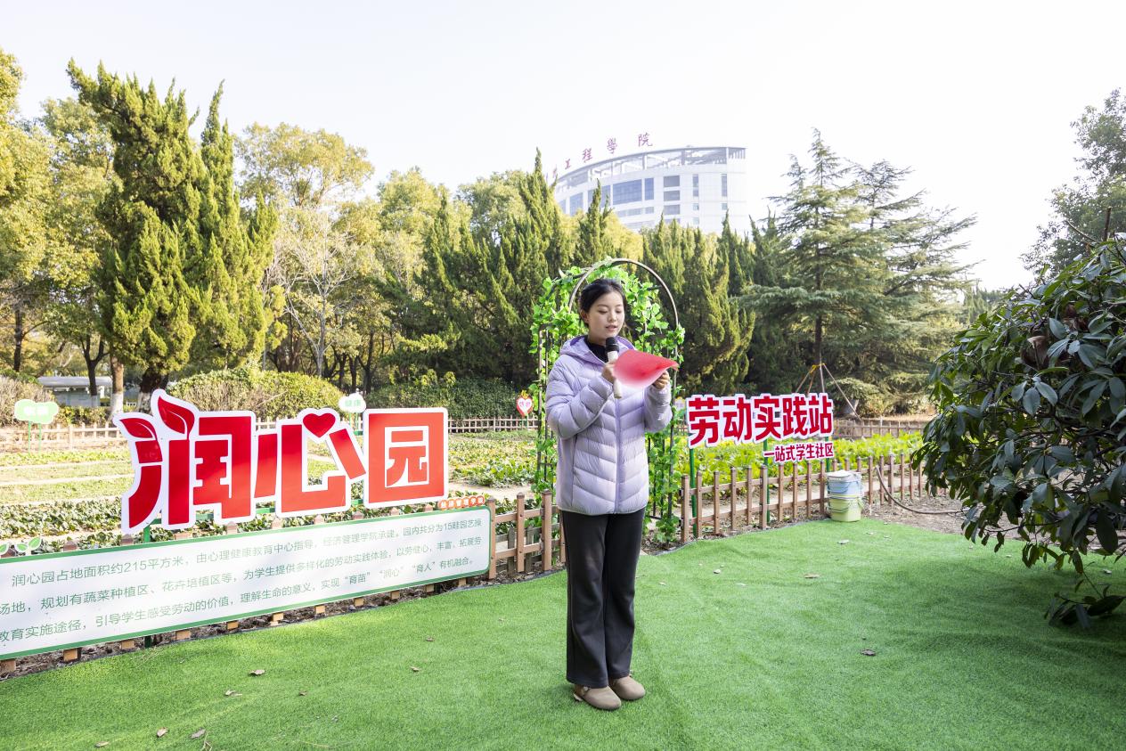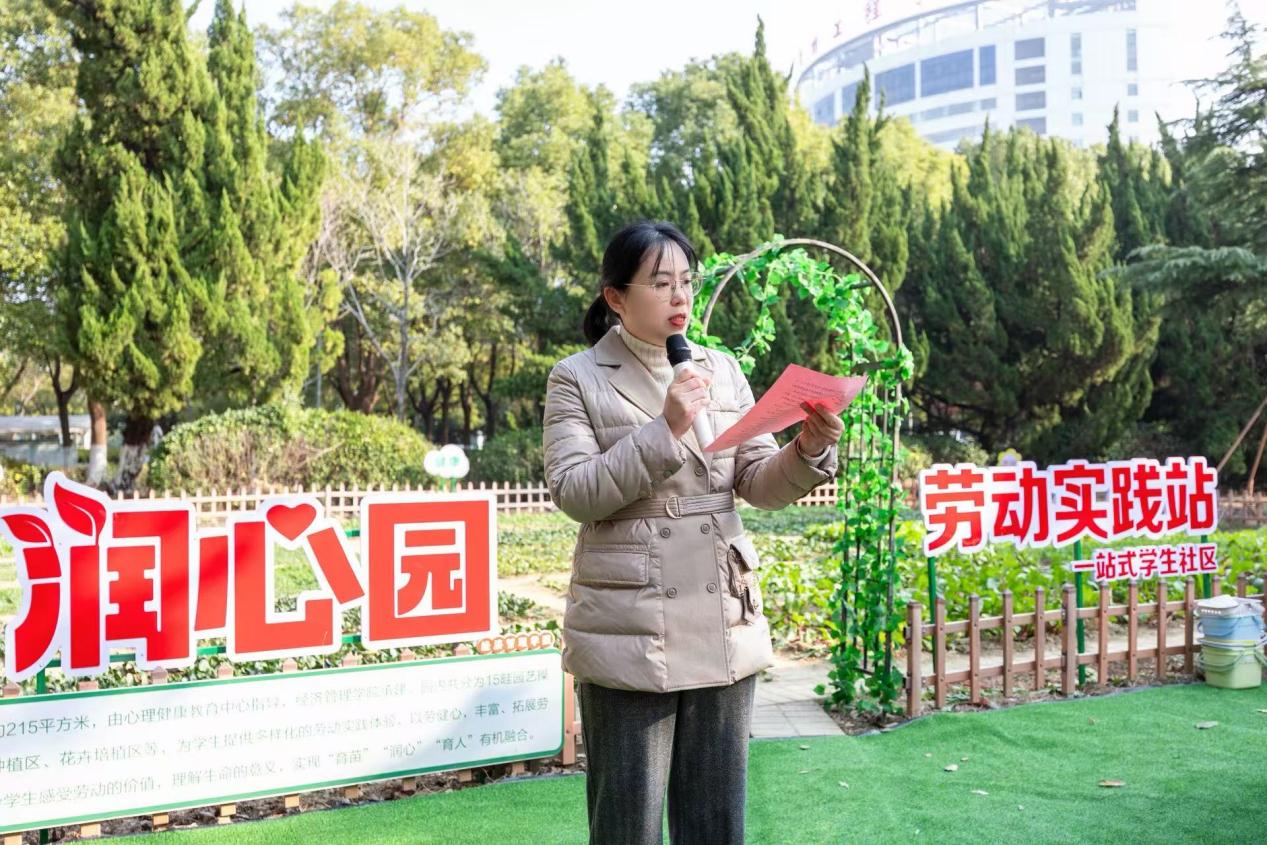 酒管2411班学生朱敏作为学生代表发言,分享她从最初对农耕的陌生,到亲身参与翻土、播种、照料、收获全过程的深切体悟,她表示,润心园教会大家的远不止农耕技能,更有协同合作的包容、责任担当的坚守与对生命的敬畏,这片土地是连接学生与自然、生活、彼此的桥梁,见证着每一份付出与成长。