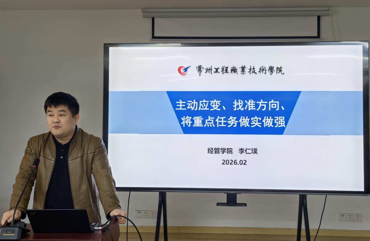 院长李仁璞以“主动应变、找准方向、将重点任务做实做强”为题作全面工作部署。他从改革紧迫性、建议思路、重点任务、优化方向四个维度,深入分析了当前职业教育面临的形势与挑战。他指出,面对人工智能技术快速发展、行业产业深刻变革、职业教育政策调整的新形势,学院必须主动应变、精准发力。他重点分析了2026年专业建设重点任务,强调要深化校企合作,做实“五金”建设,做强标志性成果。要求全体教师锚定主线、全员参与,确保每一项重点任务落到实处、见到实效。
