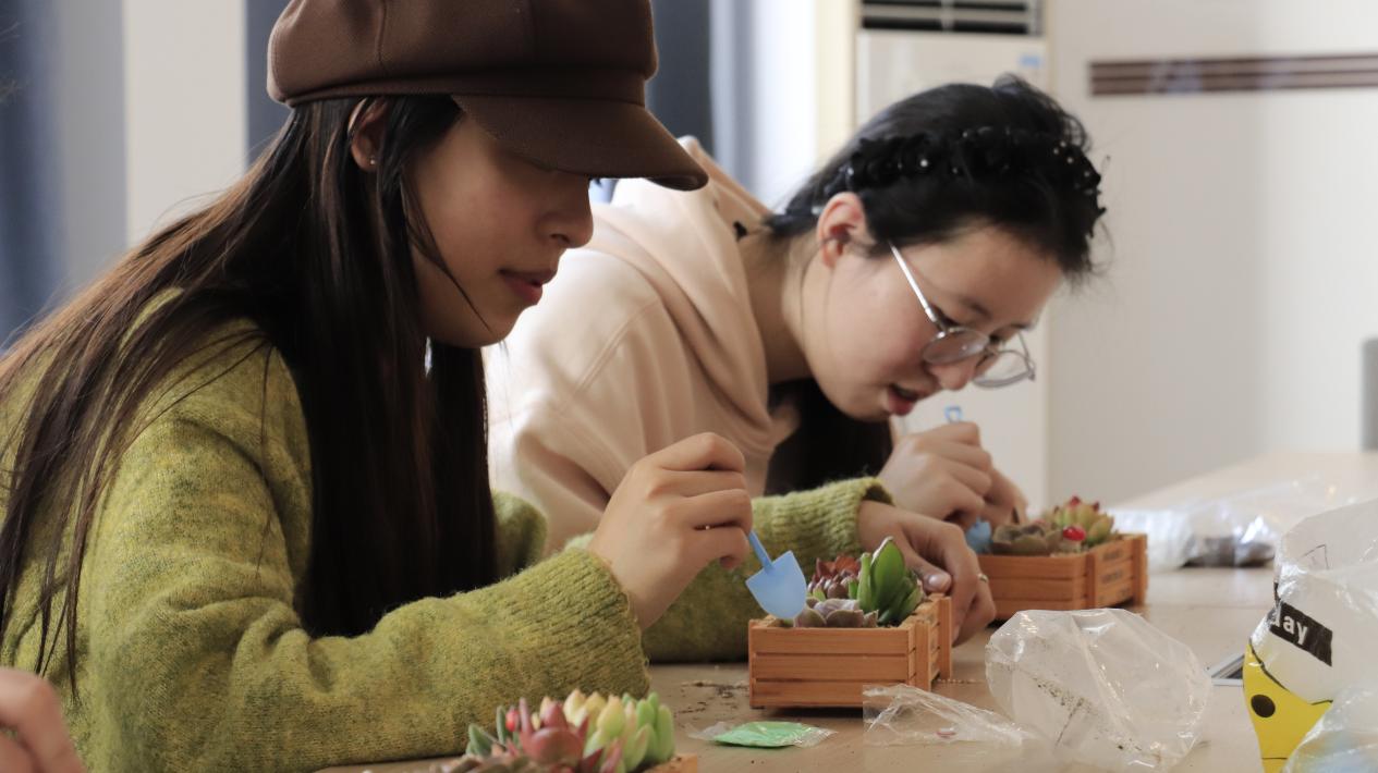多肉DIY,培育小美好。3月11日中午,在学业加油站,多肉DIY活动如期开展,同学们踊跃参与,用指尖创意点亮美好心情。活动现场,同学们充分发挥想象力和创造力,小心翼翼地挑选多肉幼苗,将不同品种、不同形态的多肉组合搭配,再铺上碎石、点缀小摆件,亲手打造独具特色的多肉盆栽。过程中,大家相互交流种植技巧,分享种植趣事,现场氛围温馨融洽。一个个小巧可爱、造型各异的多肉盆栽逐渐成型,承载着同学们的心意与期待。此次多肉DIY活动,不仅让同学们体验了动手的乐趣,更在与植物的亲密接触中舒缓了学业压力,丰富了精神生活,为心理健康注入了温暖力量。