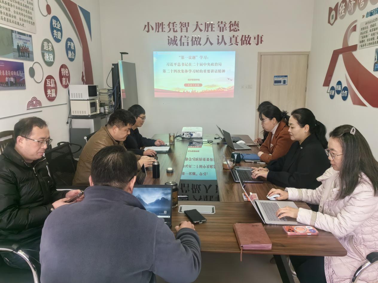 为深入学习贯彻习近平新时代中国特色社会主义思想,全面落实党中央决策部署及教育领域改革要求,切实把思想和行动统一到高质量发展上来,3月13日,经管学院党总支理论学习中心组开展本年度第二次集体学习,同步启动树立和践行正确政绩观学习教育。党总支委员、班子成员、两办主任、教研室主任、党支部书记参加了本次学习,学习会由党总支书记徐标主持。