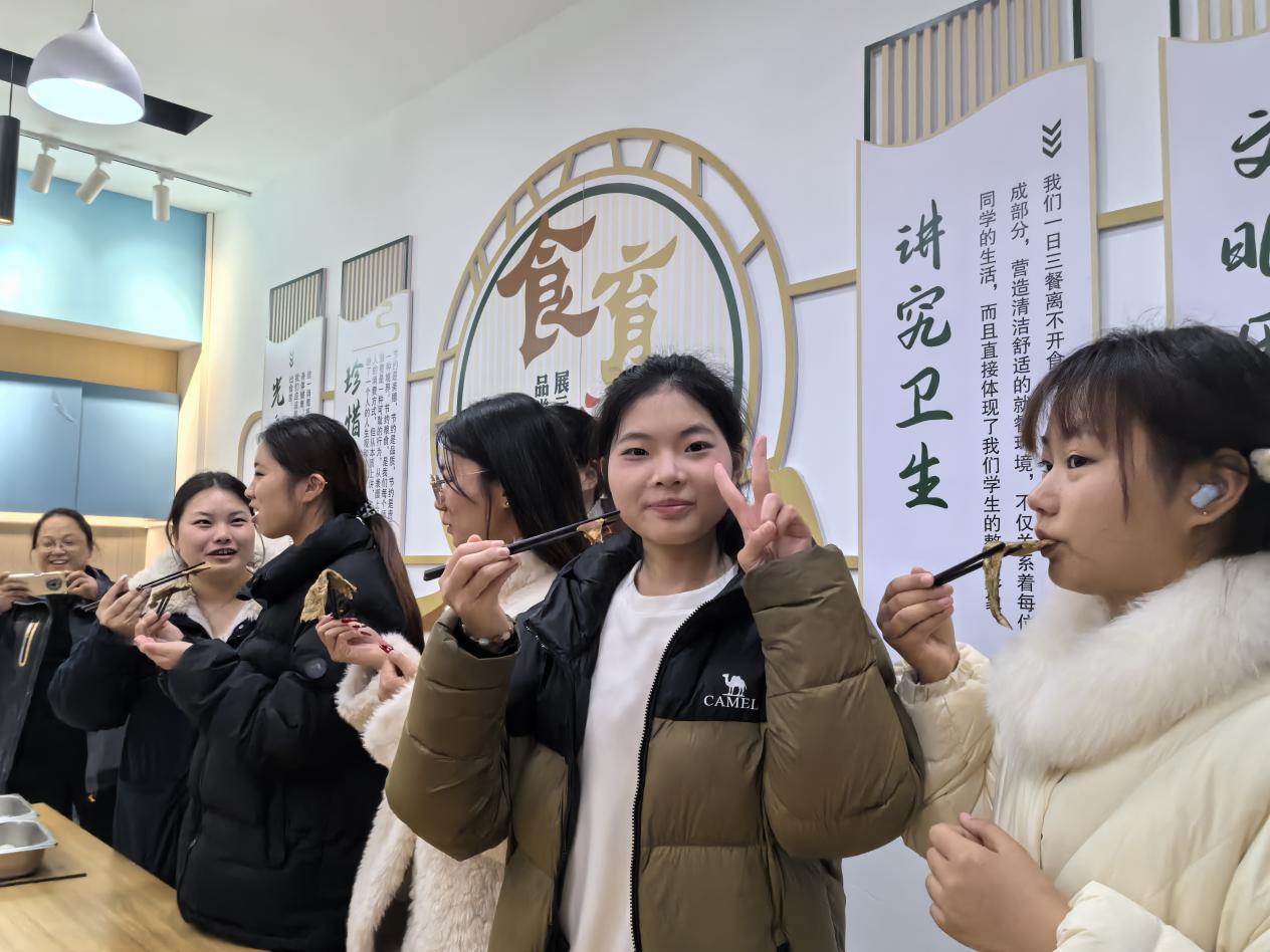 活动伊始,学院党总支副书记华亚围绕春季节气特点,生动讲解了春卷、香椿的民俗渊源与营养价值。春卷寓意“一卷藏春”,香椿作为时令“树上蔬菜”,承载着人们尝鲜迎新的生活智慧。从食材由来到节气食俗,同学们在轻松的氛围中走近传统,品味自然时令背后的文化意蕴。在实践环节,同学们分组协作,开启“春日第一卷”的制作。摊皮、包馅、卷边,一道道工序在食堂师傅的指导下逐渐熟练;香椿切碎与蛋液融合,入锅煎至金黄,浓郁的香气弥漫整个厨房。大家在动手操作中沉浸其中,在协作配合中完成从食材到美食的转化。经过一番忙碌,热气腾腾的春卷和香椿煎蛋陆续出锅,同学们围坐在一起,品尝着自己的劳动成果,分享着制作心得,共享厨房里洋溢着满足与喜悦的氛围。