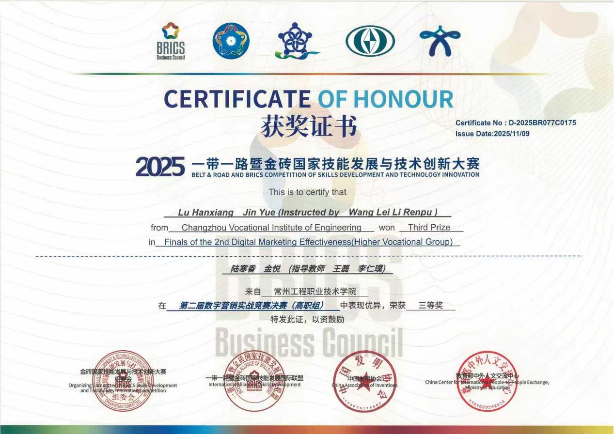 (3)一带一路暨金砖国家技能发展与技术创新大赛之第二届数字营销实战竞赛全国三等奖。该比赛选手通过全网实景数字化营销平台,完成作品的创作与发布,并通过数据分析等方式,展现信息传播的匹配度与精准度。